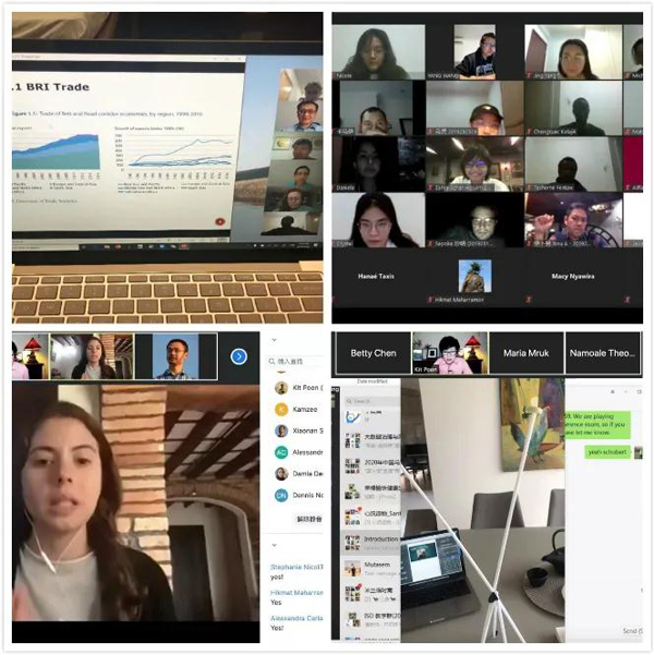 《全球化与治理》的授课外专Sara. Bice现身在澳大利亚,选课的40多名同学分布在20个国家,11个时区,为了能够让每位同学都能参与学习和讨论,Sara老师把录播的课程上传到YouTube和雨课堂,并和同学们商定了每周四次的在线讨论课堂,同学们自主选择参加其一,并通过雨课堂的课后习题进行检测,保证学习质量。《科技创新与创业》的授课教师周源老师在课程中综合使用了荷塘雨课堂的投票、主观题、选择题与随机点名等功能进行了有效互动,同时通过播放相关视频等方式活跃课程气氛。同学们发言非常积极踊跃,并针对不懂的问题积极在Zoom、微信群进行提问。潘洁老师主讲《可持续发展概论》课程的24名修课学生来自世界17个国家,线上授课具有超越地域限制的优势,对国际生课程意义重大。课程开始,潘老师让大家用身边的东西搭一座塔,并向大家展示自己的成果,由此引入了可持续发展这一概念,详细讲述了其发展历史和内涵的演变。张鹏龙老师在《“一带一路”与全球经济新格局》课程结束后说:“本课程主要讲授“一带一路”倡议与世界经济。在线视频教学让来自不同国家、不同文化、不同经历的人们“坐在一起”,以会议的形式畅所欲言,各抒己见,寻求共识,恰好也是“一带一路”倡议下,兼容并包、合作共赢文化的具体表现。”于安老师通过雨课堂和Zoom平台,向同学们生动的讲解《公法》课程。