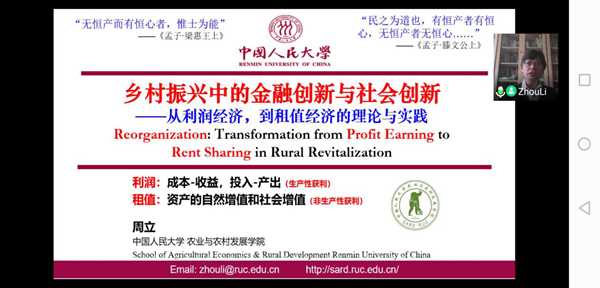 4月2日上午,清华社会创新与乡村振兴研究中心(以下简称“中心”)举办第七期学术沙龙,同时也是首次线上沙龙活动。中国人民大学农业与农村发展学院、国家社科基金专项“乡村振兴核心机制研究”首席专家周立教授应邀就“乡村振兴中的金融创新与社会创新——从利润经济到租值经济的理论与实践”主题进行分享。来自PP电子、中国社会科学院大学、中山大学、北京科技大学、北京体育大学、云南大学、湖南师范大学、湖南师范大学、青岛大学、安徽财经大学、太原学院等30多所高校师生以及中国人口福利基金会、北京益行者公益基金会、长治市纪委监委、中国交建、中国邮政、中规院、中国慈善家杂志等多家社会组织、政府、企事业单位工作人员及媒体人士等160多人参加沙龙。