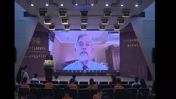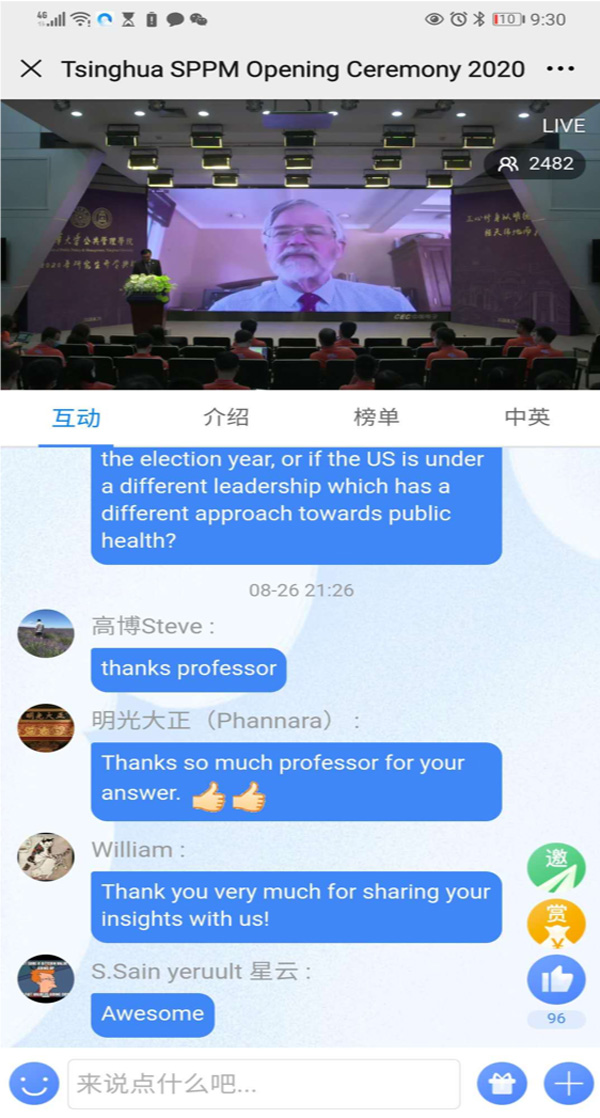 教授的讲座无疑带给学生多视角的思考与启发。在超过半小时的互动环节中,教授详细回答了学生们的问题。学生们的问题涵盖疫情发展及应对措施、中美关系、国家体制与抗疫效率、政府决策与公共治理等各个方面。过程中,教授有感于清华公管学子提问的犀利视角与机智,还风趣回答了学生对美国2020年大选结果预言的请求。在讲座结束时,教授再次表达了对即将开始在清华公管学习的新生的美好祝愿。作为学院秋季开学典礼的最后一环,随着教授讲座的结束,公管学院2020年秋季学期开学典礼也画上了圆满句号。