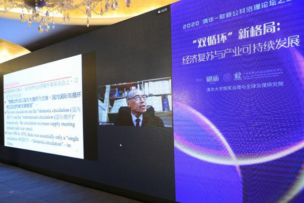 刘遵义教授通过视频连线进行了主题为《试论“双循环”》的主题演讲。刘遵义将双循环理解为国内和国际的循环,并认为循环意味“需求和供给互相碰到”。针对目前中美贸易摩擦和疫情爆发的国际形势,刘遵义认为目前完全孤立和自给自足是可以做到的,但会导致全国生活水平的下降,且中国在经济全球化中受益良多,不适合回到“单循环”,而应当坚持“双循环”。中国有可能和美国经济脱钩,但必须加强和其他国家的联系。为了实现经济的可持续发展,我们需要寻找第二供应来源以避免供应链中断,同时促进资源多元化和循环使用、加强自主创新,扶持幼稚产业、通过调整工资机制提高家庭消费,并且加大公共消费。
