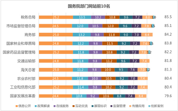 国务院部门网站中,税务总局、市场监督管理总局和商务部位列前三名,国家林业和草原局、国家药品监督管理局、交通运输部、海关总署、农业农村部/工业和信息化部(并列第八名)、国家发展改革委分列四至十名。得分如下: