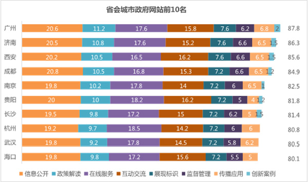 省会城市政府网站中,广州、济南和西安位列前三名,成都、南京、贵阳、长沙、杭州、武汉、海口分列四至十名。得分如下: