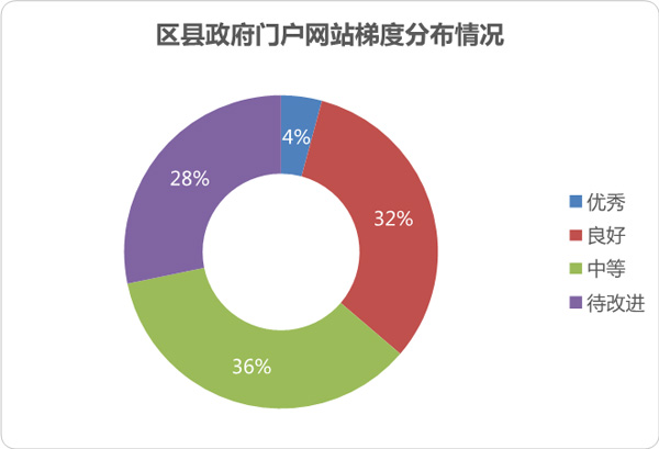 区县级政府门户网站中,11家网站位于“优秀”梯度,83家位于“良好”梯度。区县级政府门户网站梯度分布情况如下: