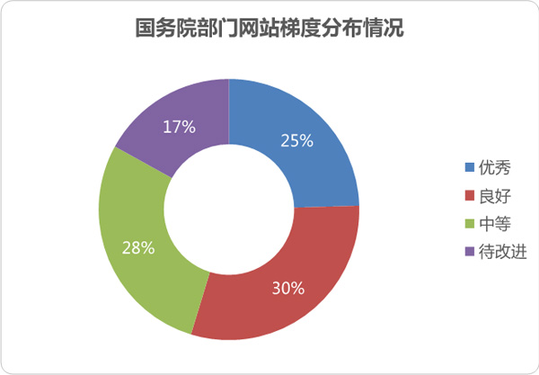国务院部门网站中,9家网站位于“优秀”梯度,17家位于“良好”梯度。国务院部门网站梯度分布情况如下: