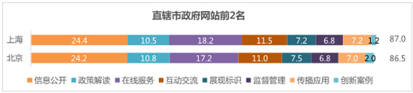 直辖市政府门户网站中,上海和北京位列第一和第二名,得分如下: