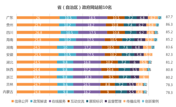 省(自治区)政府门户网站中,广东和贵州位列前二名,四川和海南并列第三名,湖南、安徽、湖北、陕西、浙江位列第五至第九名,吉林和内蒙古并列第十名。得分如下: