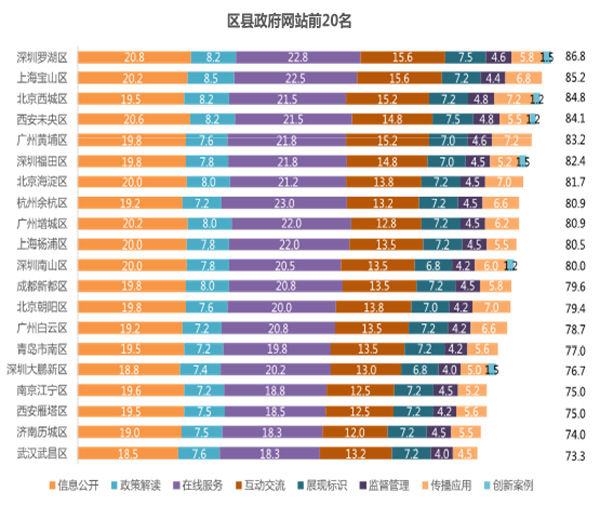 本次区县政府网站的评估范围是直辖市和副省级城市所辖区县。其中,深圳罗湖区、上海宝山区、北京西城区位列前三名,西安未央区、广州黄埔区、深圳福田区、北京海淀区、杭州余杭区/广州增城区(并列第九名)、上海杨浦区位列四至十名,深圳南山区、成都新都区、北京朝阳区、广州白云区、青岛市南区、深圳大鹏新区、南京江宁区/西安雁塔区(并列第十七名)、济南历城区、武汉武昌区位列十一至二十名。得分如下: