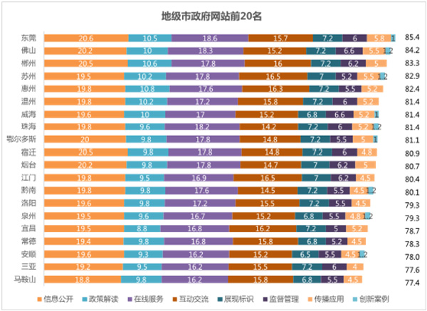 地级市政府门户网站中,东莞、佛山和郴州位列前三名,苏州、惠州、威海/温州/珠海(并列第六名)、鄂尔多斯、宿迁分列四至十名,烟台、江门、黔南、洛阳/泉州(并列第十四名)、宜昌、常德、安顺、三亚、马鞍山分列十一至二十名。得分如下: