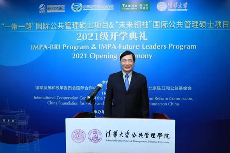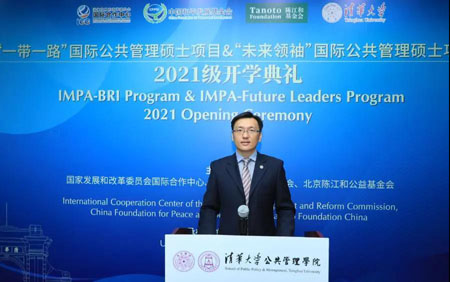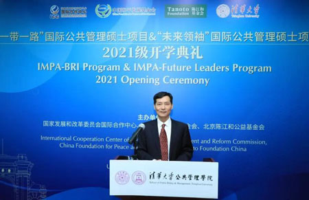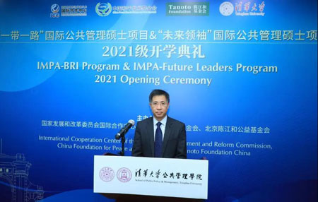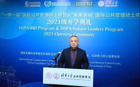 彭宗超代表公管学院致辞。他首先代表学院全体师生向出席本次活动的各位嘉宾表示热烈欢迎,并衷心感谢国家发展和改革委员会国际合作中心、中国和平发展基金会以及陈江和基金会对学院这两个项目一以贯之的大力支持。他向IMPA-BRI和IMPA-FL两个项目2021级新生表示祝贺,欢迎他们加入清华公管大家庭。他在致辞中表示,2021年,PP电子迎来了110周年校庆,2021级新生是校庆后的第一批学生,他们将见证清华新征程的开始。由于疫情原因,学院将采取线上线下相结合的融合式教学,为不能来校的学生提供在线教学与服务。希望学生们能够克服疫情带来的各种困难,顺利完成学业。他坚信,同学们在清华学习的宝贵经历将为他们未来的人生和事业发展提供强大助力。