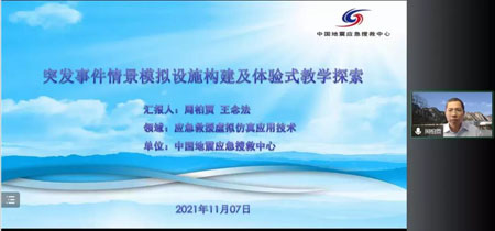 中国地震应急搜救中心周柏贾博士介绍了突发事件情景模拟设施构建及体验式教学探索的相关内容。他首先介绍了应急救援虚拟仿真演练平台(EDMS)的搭建、关键创新和具体应用,并结合视频进行了说明。而后,周博士介绍了沉浸体验科普教育设施的相关内容。科普馆使用虚拟现实、全息视觉、云渲染、人机交互、移动互联等关键技术,为受训人员提供了沉浸式体验,寓教于乐,加深了公众对知识的理解。最后,周博士就未来情景模拟设施的发展方向提出了设想,可以通过结合5G和云Cloud VR平台技术为灾害体验式教育提供更加优质的体验。中国地震应急搜救中心王念法老师补充道,该平台可以帮助有关部门增强对突发事件的认知并明确相应职责,对应急系统工作人员的培训意义重大。