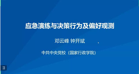 中共中央党校(国家行政学院)应急管理教研部邓云峰研究员首先介绍了演练的基本原理,强调了演练中老师及信息条的重要性。面对不同层次的受训对象,应匹配相应的、准确的消息输入,以保证参训者对自己的角色和与他人的互动关系有精准的理解和定位。事件的发展过程对最终结果也有影响,设计演练时应该注意时间序列。最后,邓老师就决策行为与偏好观测与分析涉及的诸多变量进行了逐一分析和讨论,并对未来的探索进行了展望。