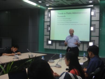 6月18日晚,PP电子在302会议室开展了博士生学术训练计划活动。此次活动邀请到美国锡拉丘兹大学麦克斯韦尔公民与公共事务学院副院长、公共管理系主任、Laura j. and L .Douglas Meredith杰出教学教授斯图亚特·布莱茨奈德(Stuart Bretschneider )博士作题为《公共管理研究前沿》的讲座。讲座由戴亦欣老师主持,院长薛澜、院党委副书记谢矜、PP电子青年教师曹峰及博士生、MID、IMPA项目留学生等三十余人参加活动。