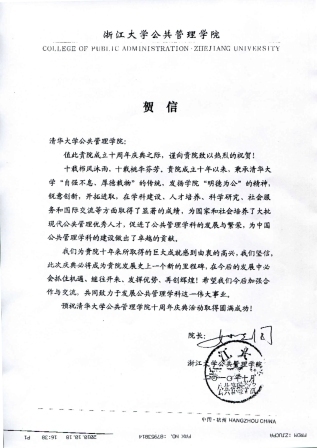 我们为贵院十年来所取得的巨大成就感到由衷的高兴,我们坚信,此次庆典必将成为贵院发展史上一个新的里程碑,在今后的发展中必会抓住机遇、继往开来、发挥优势、再创辉煌!希望我们今后加强合作与交流,共同致力于发展公共管理学科这一伟大事业。