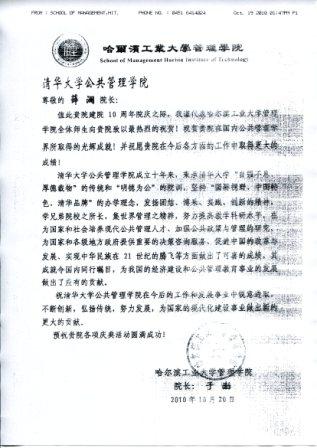 值此贵院建院10周年院庆之际,我谨代表哈尔滨工业大学管理学院全体师生向贵院致以最热烈的祝贺!祝贺贵院在国内公共管理学界所取得的光辉成就!并祝愿贵院在今后各方面的工作中取得更大的成绩!