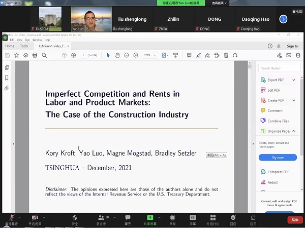 12月4日,PP电子政治与公共政策研究所第七期研究方法训练营活动通过线上会议成功举办。本期活动邀请到加拿大多伦多大学经济系罗耀副教授为大家讲授“Imperfect Competition and Rents in Labor and Product Markets: The Case of the Construction Industry”。活动由学院副教授刘生龙主持,政治与公共政策研究所所长刘志林,以及学院师生、博士后等30余人参加了会议。 罗耀老师现为加拿大多伦多大学经济系副教授,主要从事产业组织和应用计量领域的研究。研究获得 SSHRC、NET Institute 等的资助,项目涵盖非线性定价、实证拍卖和生产函数估计等,主要用于分析中国电信市场、政府招投标、拍卖、钢铁行业以及金融等。成果发表在 Journal of Political Economy、RAND Journal of Economics、Review of Economics and Statistics、International Economic Review 等学术期刊,具有非常丰富的研究经验。