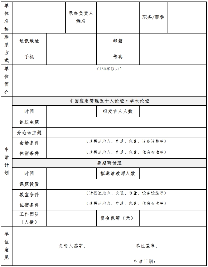 2025年中国应急管理五十人论坛·第十二届学术论坛暨第八届暑期研讨班承办申请表