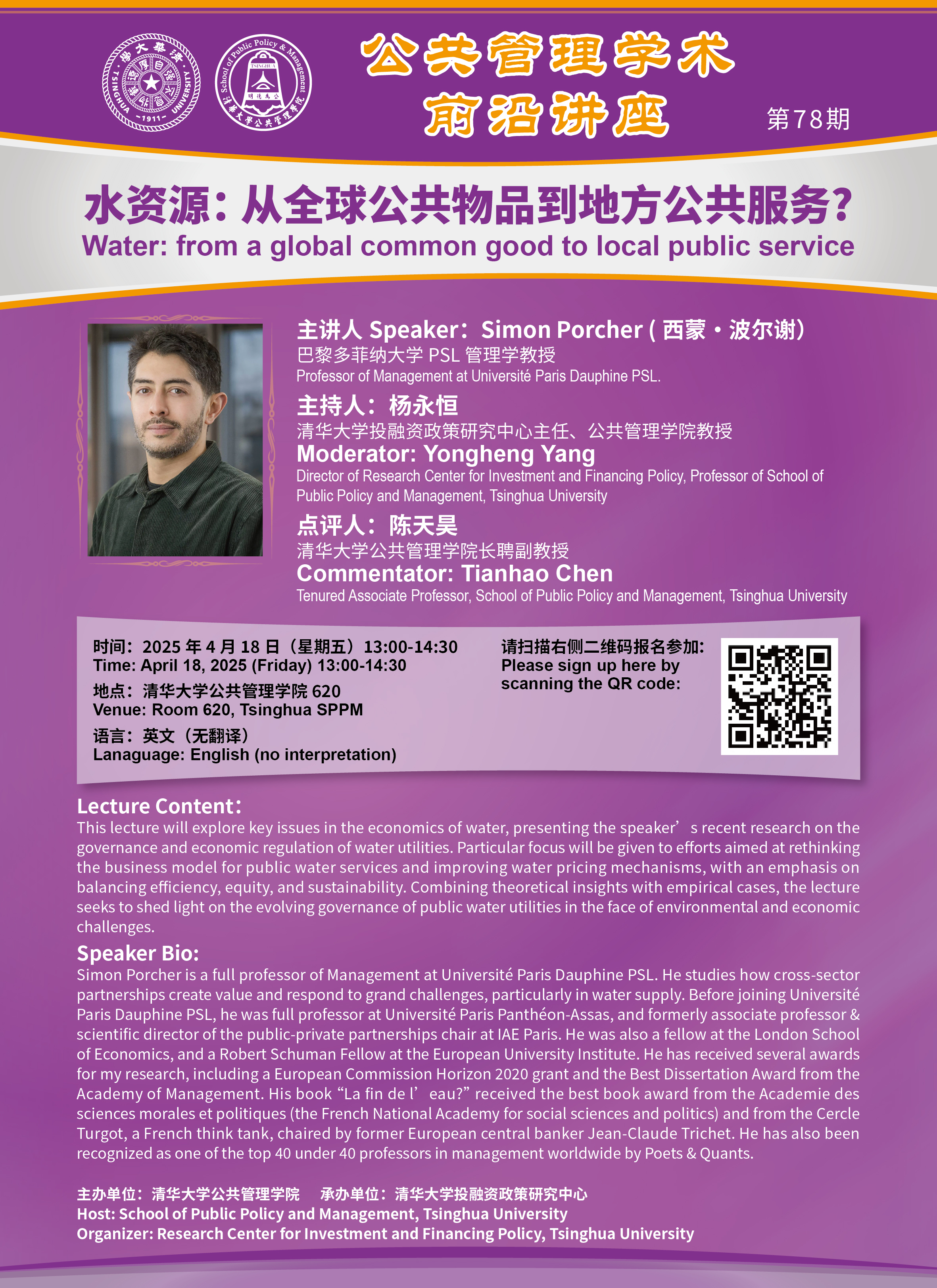 内容简介:本讲座将围绕水经济学的前沿议题展开,主讲人将系统介绍其近年来在水务治理与经济规制方面的研究成果,重点包括:如何重新构建公共供水服务的商业模式,以及在确保效率、公平与可持续性的前提下优化水价机制。通过理论分析与实证案例相结合的方式,讲座旨在探讨公共水务在当前环境与经济双重挑战下的治理转型路径。