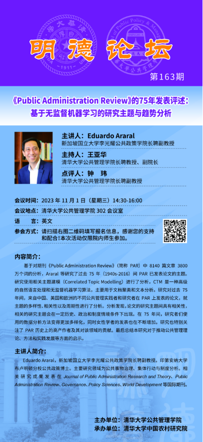 【主讲人简介】Eduardo Araral,新加坡国立大学李光耀公共政策学院长聘副教授。印第安纳大学布卢明顿分校公共政策博士。主要研究领域为公共事物治理、集体行动与制度分析。相关研究成果发表在Journal of Public Administration Research and Theory、Public Administration Review、Governance、Policy Sciences、World Development等国际期刊。