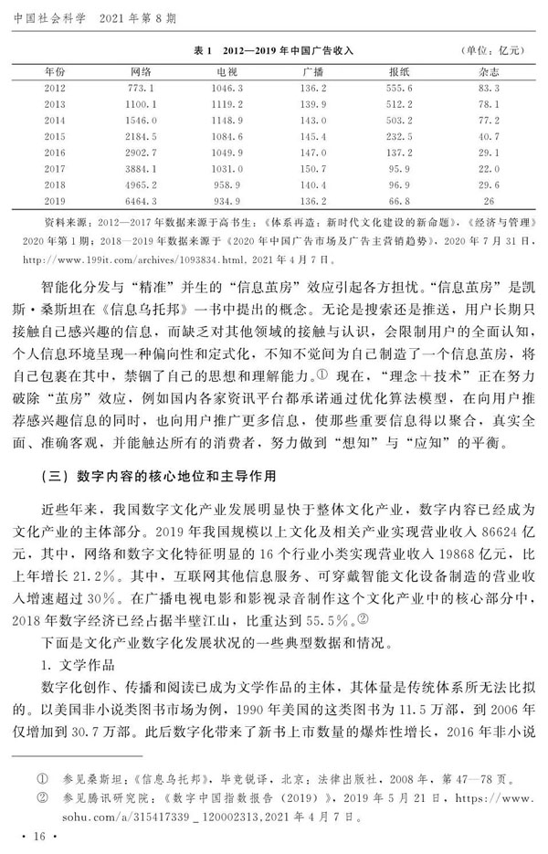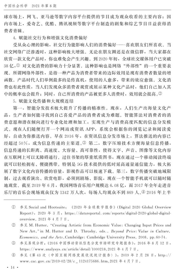 文章指出数字技术极大地推动了文化产业发展,文化产业也成为数字技术最重要的应用领域之一,数字文化产业的现状与未来成为重要研究领域。技术与文化关系的演变分为技术未赋能、技术加持和数字技术赋能三个阶段。可以从赋能消费者、赋能创意者、赋能生产者、赋能社交行为和赋能文化传播五个方面来分析数字技术如何提升文化产业的效率,如何推动数字内容成为文化产业的主体部门和数字传播成为文化传播的主要渠道。