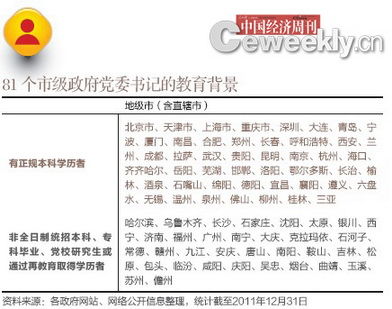 据统计,81个城市中,市政府党委书记中,有正规本科学历者共计47人,非全日制统招本科、专科毕业、党校研究生或通过再教育取得学历者共计34人。其中,4个直辖市、5个计划单列市的市委书记全部拥有正规本科学历。