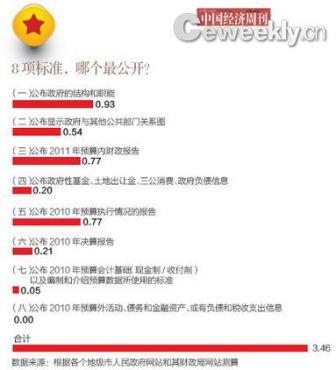 并列排名第二的是(三)公布2011年预算内财政报告和(五)公布2010年预算执行情况的报告,均为0.77分。一个值得注意的现象是,应该同步公布更彰显“透明度”的预算和决算,政府往往总是选择其中一项公布,且公布预算的情况要远远好于公布决算的情况——(五)公布2010年预算执行情况的报告为0.77分,而(六)公布2010年决算报告仅为0.21分。