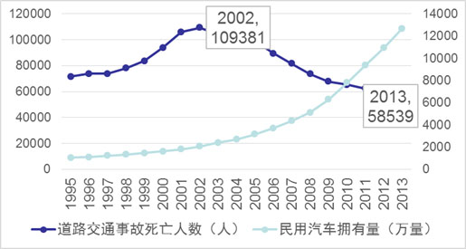 政府在提供公共安全方面,也取得了重大的进展。怎样衡量政府工作?其中一个很重要的指标就是如何确保公共安全、生产安全,实现经济活动越活跃,人员流动越频繁,各类安全指标明显改善,实现与各类事故死亡人口增长脱钩。从“十一五”、“十二五”连续两个五年规划提出了加强公共安全建设,以及具体的核心指标,已经产生明显效果,其中五类指标均大幅度持续下降,特别是各类生产安全事故和道路交通事故死亡人数明显下降(见表5),呈现了脱钩现象。例如2002年,道路交通事故死亡人数达到高峰,而后持续下降,到2013年,已降至不足6万人,但是民用汽车保有量已经突破了1.27亿辆。(见图1)。
