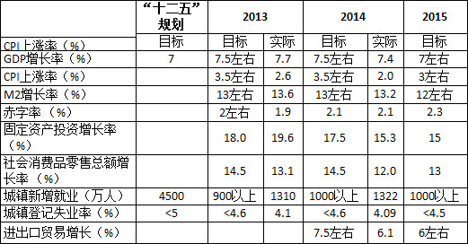 在讨论2015年经济社会发展的主要目标时,我们有必要与以往的目标做一比较。2014年经济社会发展的主要预期目标是:国内生产总值增长7.5%左右,居民消费价格涨幅控制在3.5%左右,城镇新增就业1000万人以上,城镇登记失业率控制在4.6%以内,国际收支基本平衡,努力实现居民收入和经济发展同步。加强对增长、就业、物价、国际收支等主要目标的统筹平衡。2014年实际量化指标共5个(包括居民收入增长)。