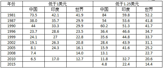 表4 中国、印度和世界国际贫困线人口发生率(1981-2015)