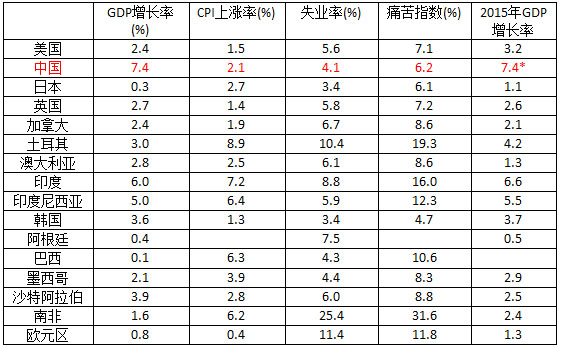 注:痛苦指数系CPI上涨率与失业率之和;2015年GDP增长率为预测数,其中中国数据为作者估计数;