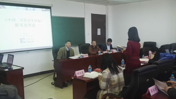 胡鞍钢向到场媒体解读新著《中国:决胜百年目标》。