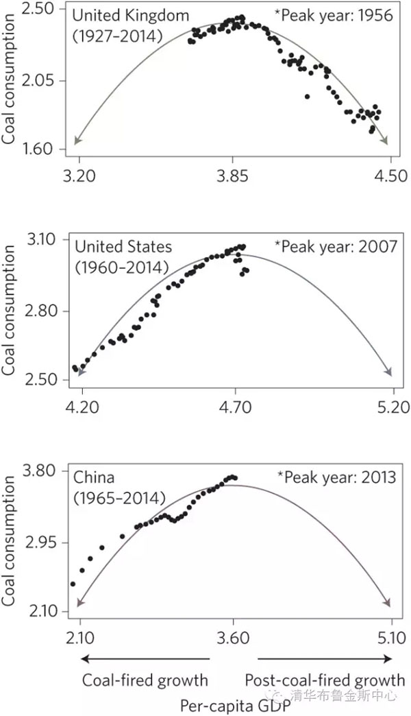 历史上,煤炭消费的达峰是一些发达国家发展的重要里程碑。以英国和美国为例,他们先经历了由煤炭时代到油气时代的转变,并开始逐渐进入清洁能源时代。中国正在积极地终结煤炭时代,缩短自己的油气时代,提前走向清洁能源时代。与英美两国相比,中国在一个更低的发展阶段完成了煤炭消费的达峰。以购买力计算,中国的富裕程度比英美煤炭达峰时分别低10%(1956年)和75%(2007年)。考虑到中国的工业化程度、庞大的人口、以煤为主的资源禀赋,如此迅速的达峰与有效的政策引导关系密切。