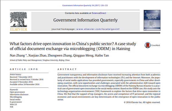 近日,PP电子张楠、赵雪娇、张钟文、孟庆国、谭海波合作撰写的论文《哪些因素驱动中国公共部门的开放创新:基于海宁“微博公文”的案例研究》(What factors drive open innovation in China's public sector? A case study of official document exchange via microblogging (ODEM) in Haining)在国际信息管理与电子政务领域顶级学术期刊《政府信息季刊》(Government Information Quarterly)2017年第1期发表。