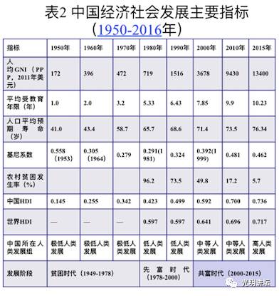 此外,不仅是经济发展,还包括创新驱动发展,尤其是这次五年规划,明确提出了一系列的量化指标,推动中国的原始性创新,也推动中国进入到数字化智能化时代。同样,这个五年规划对民生福祉进行了专门的设计。特别是在这次五年规划中,又重点设计了资源环境指标,这是中国发展的难中之难,也是重中之重。如果能够如期完成以上“十三五”规划的目标,从专业视角看,中国就可以实现第一个百年目标。从HDI的指标来看,2015年中国HDI指数已经达到0.738,已经进入到高人类发展水平。到2020年还会进一步的提高。从1978年到2020年,我们从拥有世界最大规模的绝对贫困人口8亿多人,变成了世界最大的小康社会——14.2亿人。这就是我们实现第一个百年目标,对人类最大的贡献就是消除了世界最大的绝对贫困人口。中国已经站在新的发展起点上,进入新的更高发展水平阶段。这就要站得更高、看得更远、想得更深,构想后2020年的目标。它的理论基础是什么呢?我们把它称之为社会主义初级阶段下半场的第二个阶段,它的主题是什么呢?就是全面建设共同富裕社会的阶段。