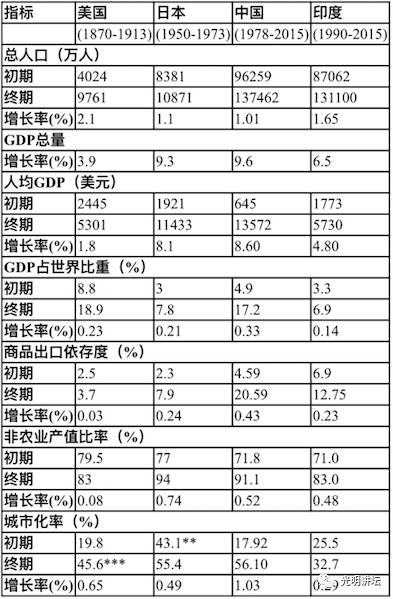 在图二我特别例举了四个重要国家,第一个是美国,它的经济起飞时期是1870—1913 年,用了40年时间完成从经济起飞到世界强国的过程,年均经济增长率为4%。第二个是日本,在1950-1973年经济起飞,年均经济增长率高达9.3%,这就是所谓的“日本奇迹”,超过了“美国奇迹”。第三个就是中国,从1978年到2015年,年均经济增长率为9.6%,也创造了“中国奇迹”,超过了“日本奇迹”。第四个是1991-2015年印度的经济起飞,年平均增长率为6.5%。