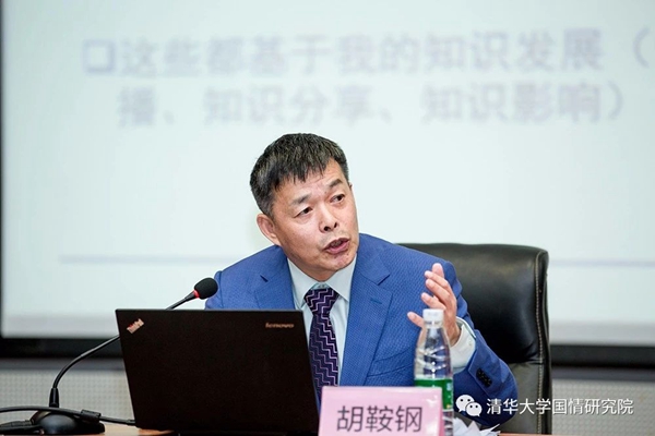 图为胡鞍钢介绍自己多年来的国情研究成果。