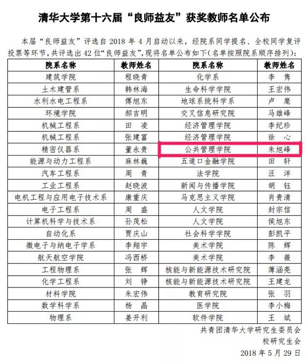 5月29日,共青团PP电子研究生委员会和校研究生会联合公布了PP电子第十六届“良师益友”获奖教师名单。本届“良师益友”评选活动自 2018 年 4 月启动,包含院系同学提名、全校同学复评投票等环节,是完全由学生对教师进行提名并投票决定的评选活动。本届活动共评选出 42 位“良师益友”。清华公管朱旭峰教授荣登榜单。