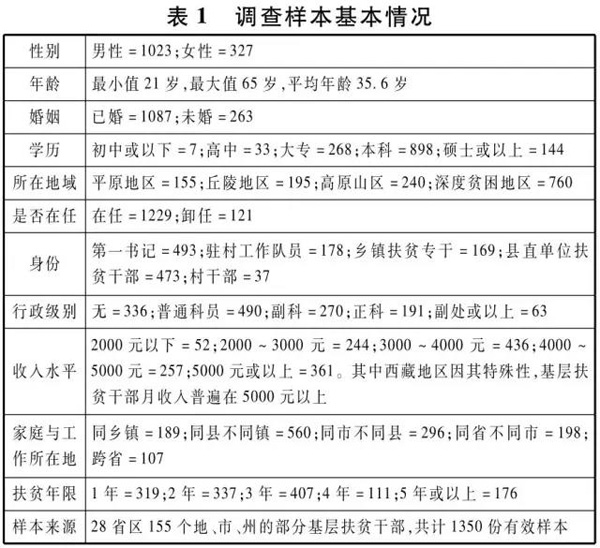 作者于2018年年初,针对驻村第一书记、驻村扶贫工作队员、乡镇扶贫专干、县直单位帮扶干部和贫困村村干部共五类基层扶贫干部,在全国范围内开展了职业倦怠专项问卷调查,共获得1366份调查样本,涵盖全国29省区155个地、市、州,其中有效样本为1350份,样本有效率为98.8%,此次问卷调查采用了国际上通用的MBI-GS职业倦怠测量量表,从职业情感、工作态度和职业成就感三个维度调查基层扶贫干部的职业倦怠水平,具体结果如表1所示。