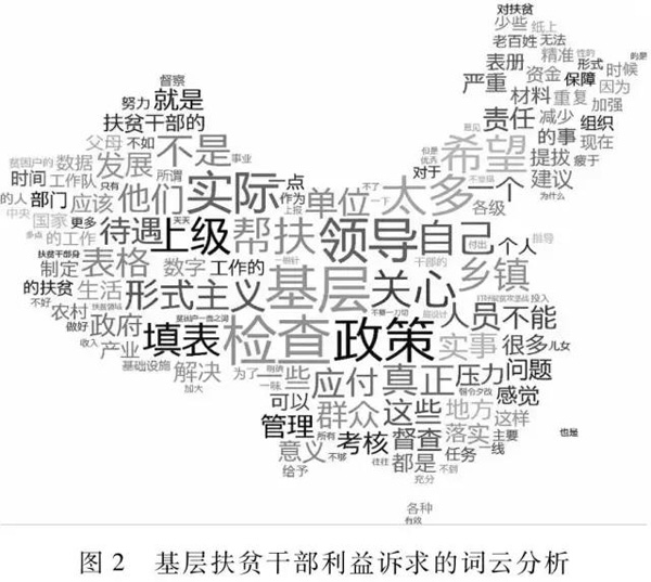 除了上述问卷调研数据,笔者还通过访谈收集了基层扶贫干部们对扶贫工作的意见看法,本文采用Tagxedo软件对收集到的862条意见和建议共计19000余字进行了词云分析(如图2所示),以此可以窥见基层扶贫干部们比较在意的利益诉求,对于改进当前扶贫工作具有重要参考价值,也是本文最后提出的对策建议的重要参考依据。