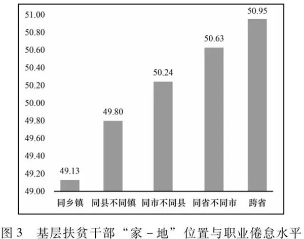 此外,扶贫工作是对资源的重新分配,往往会涉及到利益主体的博弈和平衡。基层扶贫干部在一线扶贫工作中经常会面临一些带来负面情绪的事情,处理十分棘手的问题,时间长了就容易对个人的心态和心理造成一定的负面影响。驻村扶贫干部尤其是那些在非工作所在地和非家乡所在地开展扶贫的干部往往都是离开家人独自一人,如果遇上交通不便、交通成本高,就会长期无法与家人团聚,生理和心理需求都无法得到及时满足,造成情绪沮丧、易怒暴躁。调查中发现,家庭与工作所在地距离越远的干部职业倦怠越严重(如图3)。西南深度贫困地区某央派驻村第一书记工作地和家乡都在东部沿海城市,只能长久待在闭塞的山村里,一年后经常出现沮丧情绪,隔三岔五在村委会以喝酒和哭泣排解心中寂寞。由于缺乏心理健康意识,这些负面情绪不能及时通过自我调适或寻求专业帮助及时宣泄,就容易导致心理问题日趋严重,产生职业倦怠。