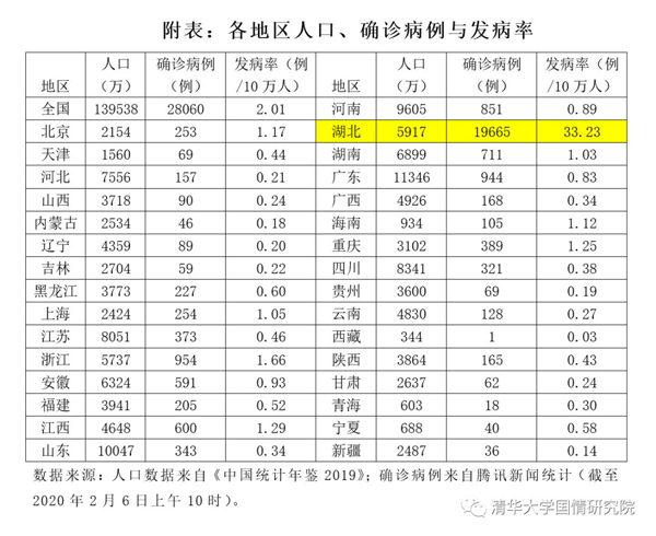 这表明,从全国各地区开展抗疫工作的情况来看,大部分地区处在有效控制之中,但是各个地区的疫情状况具有很大差异(见附表)。从人口发病率和病死率来看,湖北省显著高于其他地区。