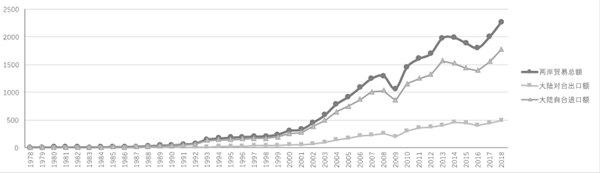1978年中国大陆改革开放后,两岸开始贸易往来,当年大陆对台出口0.5亿美元,之后两岸投资额逐年增加。商务部数据显示,两岸贸易额从1989年的34.8亿美元增长为 2018年的2262.5亿美元。2018年,大陆与台湾贸易额中,大陆对台湾出口486.47亿美元,同比上升10.6%;自台湾进口1775.98亿美元,同比上升13.9%,台湾对大陆贸易顺差达1289.51亿美元。台湾是中国大陆第五大贸易伙伴和第三大进口来源地,大陆是台湾最大的贸易伙伴和贸易顺差来源地。这为台湾经济增长提供了广阔的市场空间。从两岸商品贸易结构看,机电产品、化工产品、贱金属、塑料橡胶和光学、钟表、医疗器械等是主要商品,两岸商品贸易结构体现了台湾相关产业的出口优势。三十多年来,台湾对大陆贸易顺差对台湾经济发展起到了至关重要的作用。2000年后,台湾对大陆贸易顺差从2000年的204.5亿美元增加到2018年的1289.5亿美元,年平均增长率达到12.8%。