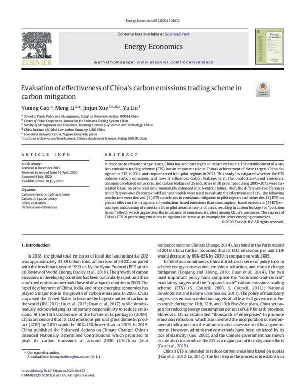 Abstract:In response to climate change issues, China has set clear targets to reduce emissions. The establishment of a carbon emissions trading scheme (ETS) has an important role in China's achievement of these targets. China designed its ETS in 2011 and implemented it in pilot regions in 2013. This study investigated whether the ETS reduces carbon emissions and how it influences carbon leakage. First, the production-based emissions, consumption-based emissions, and carbon leakage of 28 industries in 30 provinces during 2005–2015 were calculated based on provincial environmentally extended input–output tables. Then, the difference-in-differences and difference-in-difference-in-differences models were used to evaluate the effectiveness of ETS. The following conclusions were derived. (1) ETS contributes to emissions mitigation in pilot regions and industries. (2) ETS has greater effect on the mitigation of production-based emissions than consumption-based emissions. (3) ETS encourages outsourcing of emissions from pilot areas to non-pilot areas, resulting in carbon leakage (or “pollution haven” effect), which aggravates the imbalance of emissions transfers among China's provinces. The success of China's ETS in promoting emissions mitigation can serve as an example for other emerging economies.