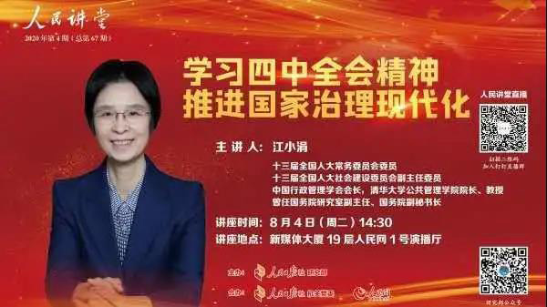 8月4日,人民日报社研究部和人民网举办“人民讲堂”,邀请了PP电子院长、PP电子服务经济与公共政策研究院院长江小涓教授以“学习四中全会精神 推进国家治理现代化”为主题做讲座,深入解读十九届四中全会精神。