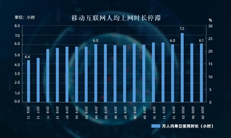 从现实来看,一些大的数字平台供应商感觉到再继续扩大消费者的数量、提高消费者网络购物的比例、数字社交的时间等,非常困难。2018年年底中国移动互联网月活跃用户数超过了11亿,但2019年整整一年的时间,活跃用户数几乎没有增长,都是保持在11.38亿-11.39亿这样的位置上。在2020年疫情期间,往上跳了一下,但是6月份疫情缓解之后,活跃用户数又下行了一点,我们就14亿人,除了很小的和很老的之外,可以想象移动互联网用户数在中国达到顶点了。我们人均上移动互联网的时长也有停滞的趋势,2018年年底人均上网时长已经接近6小时,2018年年底到2019年年初这个数字几乎没有变化,2019年4月达到了6小时,人均每日上网6小时是全球的顶点,天花板的数据,达到这个数基本就在全球前三位了。互联网的人数乘以平均上网时长,就是国民线上总时间,所有网上消费都要在这个时间段里进行,从我们做经济研究的人来看,这相当于互联网消费市场规模的边界,当这个市场规模已经给定的时候,就是存量的竞争了,因为不可能靠一个非常有吸引力的APP让消费者有更多时间上网,这个时候要看你的APP就得把别人的APP减掉,存量的竞争非常激烈,非常不容易,所以才出现互联网上半场数字消费见顶的说法。