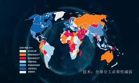 全球化推动力减弱有若干正常和非正常因素,有正常的经济原因,也有国际政治问题、个别国家行为的问题,我就技术相关因素和大家分享一下为什么全球化会退缩。从二战以后全球化的进展看,初级产品的出口国多是石油输出国,这些国家的经济体就建立在大量出口石油,进口其他产品的基础上。而制造业产品出口国,大量出口制造业产品,购进高端的设备和必要的原材料,大体上分布在南美还有以中国为中心的东亚部分,中国是一个制造业出口国。分布在北美和西欧的主要是高端设备和技术的出口国。这是全球完整的经济图谱,每个国家在其中有自己的贸易地位。二战以后,这个分工其实一直在加强,但是在过去十年有所减缓退缩。
