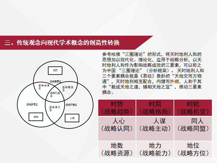 例如,我们做了一个探索,就是基于中国天时地利人和观念,这最早是兵家的思想,提出一个中国“三圈理论”的概念,实际上是跟哈佛的“价值、能力、支持”的“三圈理论”进行对话,我们认为天时地利人和要比价值能力支持三个要素更从根本上决定了战略成败,根本思想上是传统观念,但是形式上我们采用了西方现代学术的建构和表达方式。最近我们又把这个工作拓展了,就是基于中国兵家博大精深的战略思想梳理,探索将它发展为“三圈九畴”,天时包括时势(战略趋势)、时局(战略格局)、时机(战略机变),地利包括地数(战略资源)、地力(战略能力)、地位(战略方位),人和包括人心(战略认同)、人谋(战略主动)、同人(战略同盟),探索将其发展为中国战略分析理论,这个工作我们还在进行中。