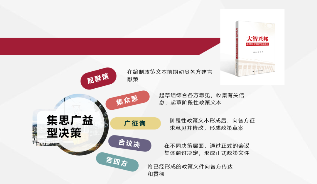例如,我们曾经做了一个关于中国五年规划编制过程概括中国决策模式的研究,通过对于五年规划决策过程梳理,我们将其概括为集思广益型决策模式,分为五个环节。
