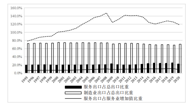 图6 全球服务品出口、制造业出口与总出口、对应行业增加值的比重