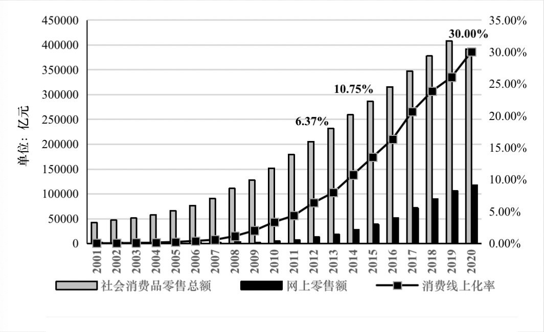 平台的海量协调能力促进了线上消费的快速发展。根据国家统计局和商务部数据,我国网络零售额增长明显快于社会消费总额。如图13所示,网络零售额由2001年的10.4亿元增长至2020年的11.76万亿元,同期社会消费零售总额由4.22万亿元增至39.20万亿元;“十五”、“十一五”、“十二五”和“十三五”期间,网络零售额年均增速分别是社会消费零售总额年均增速的7.9倍、5.6倍、4.0倍和4.1倍。消费整体线上化水平在2012年首次超过5%(6.37%),在2014年超过10%(10.75%),2020年增至30%,显示出强大增长能力。
