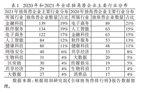 第三组是依托数据的新创企业。这些企业走在创新的潮头,以各类独角兽企业为代表。这些成立时间短、资本市场看好的新生公司不仅数量迅速增长,而且愈来愈多是数据原生企业,金融科技、软件服务、电子商务、人工智能、健康科技领域的企业占全部独角兽企业的比重均超过10%(见表1)。2021年我国独角兽企业已经全部是数据原生企业。